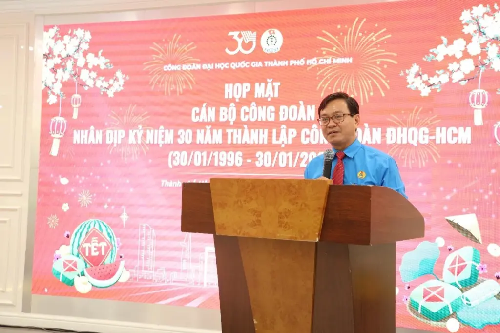 Phát biểu chúc mừng tại buổi họp mặt, PGS.TS Trần Cao Vinh, Ủy viên Ban Thường vụ Đảng uỷ, Phó Giám đốc ĐHQG-HCM ghi nhận và biểu dương những đóng góp bền bỉ, tâm huyết của các thế hệ lãnh đạo, cán bộ Công đoàn ĐHQG-HCM trong suốt 30 năm qua. Ông nhấn mạnh, dù có những điều chỉnh về mô hình tổ chức hay tên gọi, song bản chất và sứ mệnh của tổ chức công đoàn không thay đổi. Đảng uỷ, Ban Giám đốc ĐHQG-HCM luôn xác định Công đoàn giữ vai trò quan trọng trong hệ thống chính trị của ĐHQG-HCM và sẽ tiếp tục đồng hành, tạo điều kiện để Công đoàn phát triển vững mạnh. Phó Giám đốc ĐHQG-HCM cũng bày tỏ kỳ vọng đội ngũ cán bộ công đoàn hôm nay tiếp tục phát huy tinh thần trách nhiệm, tâm huyết và cống hiến, góp phần vào sự phát triển chung của ĐHQG-HCM.
