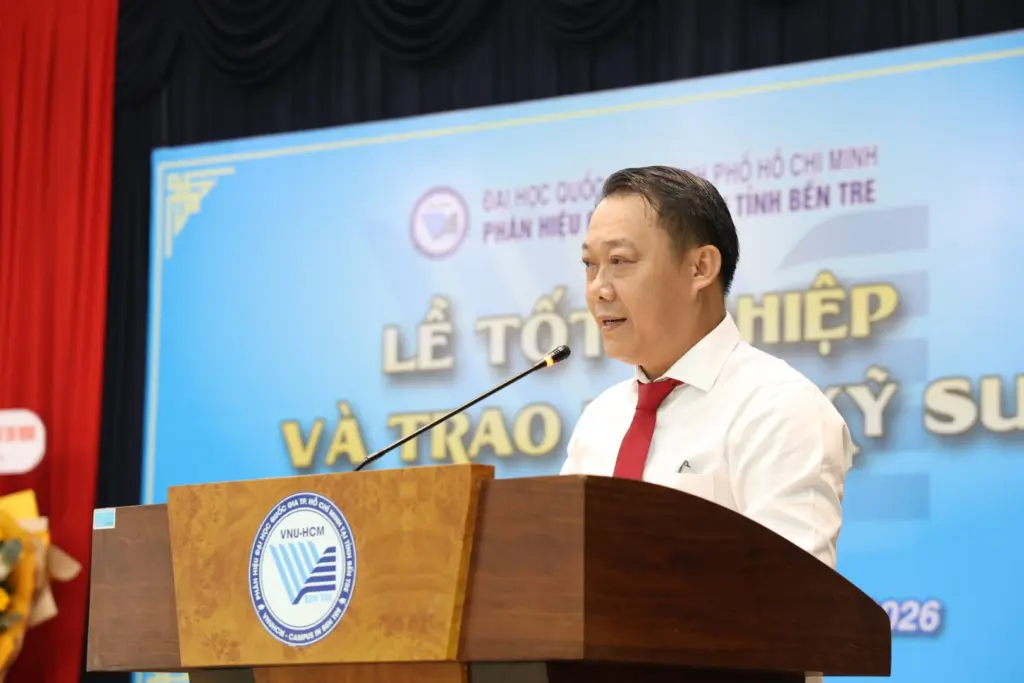 Ngày 23/1/2026, Phân hiệu ĐHQG-HCM tại tỉnh Bến Tre (nay thuộc tỉnh Vĩnh Long) đã tổ chức Lễ tốt nghiệp và trao bằng kỹ sư cho sinh viên ngành Kỹ thuật xây dựng đủ điều kiện tốt nghiệp đợt 2 năm 2025. Tham dự buổi lễ có PGS.TS Nguyễn Minh Tâm – Phó Giám đốc ĐHQG-HCM, đại diện lãnh đạo các sở, ban, ngành địa phương, quý thầy cô giáo, phụ huynh và sinh viên Phân hiệu.
