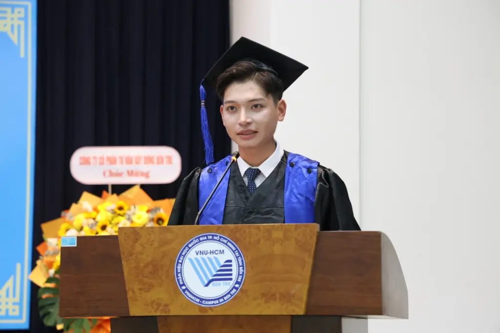Đại diện sinh viên tốt nghiệp, Nguyễn Quốc Duy – sinh viên lớp Kỹ thuật xây dựng khóa 2021 xúc động chia sẻ, bốn năm học tập tại Phân hiệu ĐHQG-HCM không chỉ mang lại tri thức chuyên môn mà còn giúp sinh viên rèn luyện bản lĩnh, nhân cách và tinh thần trách nhiệm. “Thầy cô không chỉ dạy chúng em cách làm nghề, mà còn dạy cách làm người, cách đối diện với thử thách bằng bản lĩnh và sự tử tế”, Nguyễn Quốc Duy bày tỏ.